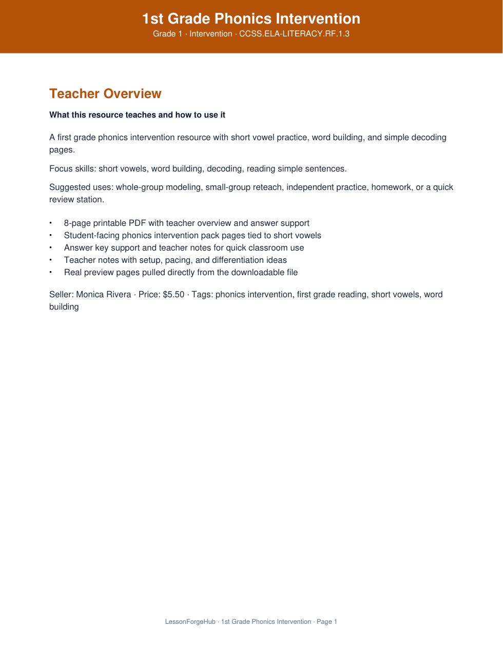 This first grade phonics intervention pack gives teachers a simple decoding resource built for small groups and targeted review. Students practice short vowels, word building, and reading simple words in context with pages that are easy to print and use. Teacher notes and answer support are included for quick implementation.