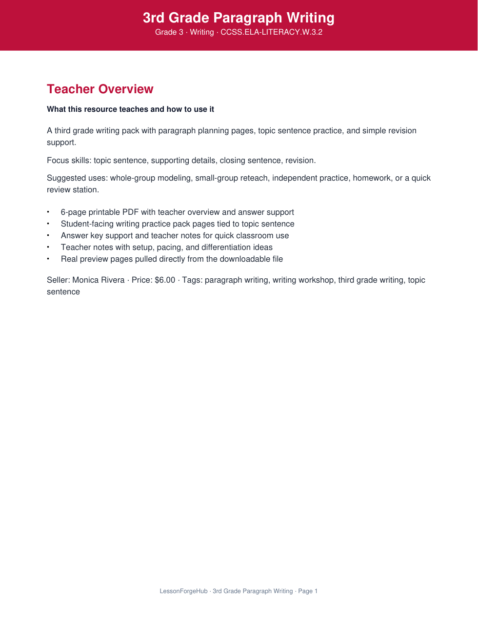 This third grade paragraph writing resource supports the basics of organized writing in a way that feels manageable for young writers. Teachers get planning organizers, guided paragraph frames, and short editing prompts that fit writing workshop, intervention, or homework. The answer support focuses on what a strong paragraph should include, not one perfect response.