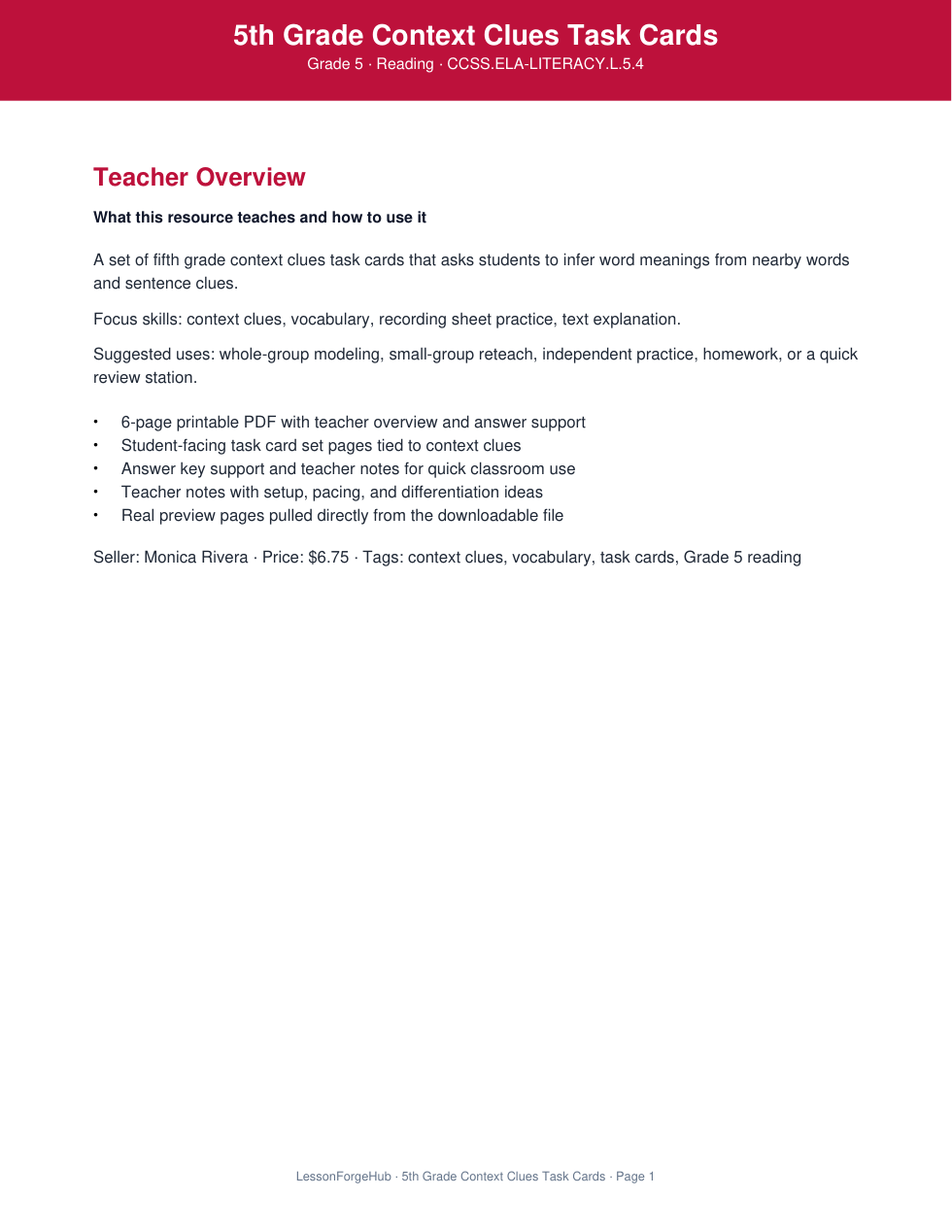 This fifth grade context clues task card set gives teachers a flexible vocabulary resource for literacy stations, review rotations, or partner practice. Students read short passages, infer word meanings, and explain which clue helped them decide. The file includes task card pages, a recording sheet, and teacher support notes.