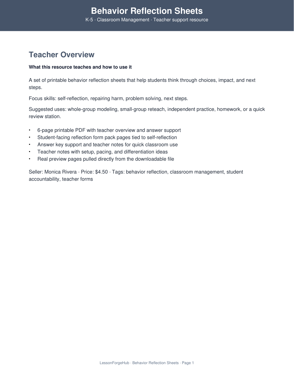 This behavior reflection pack gives teachers clear, calm forms for helping students think about what happened, who was affected, and what they can do next. The pages are designed for elementary classrooms and include teacher notes for using the forms as part of a supportive behavior routine.